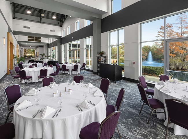 Gather on the open veranda and look out at the serene cypress pond as the sun starts to set the scene. With numerous A/V equipment and catering packages, your event is set up for success. Looking for an indoor setting? With such a versatile facility, you can be the host of any gathering you can dream of. Hold seminars in the Grand Hall, professional brainstorm sessions in the boardrooms, large conferences in the Garden Suites, or even banquets in the Gazebo Suites. Adorned with modern interiors and covered garden views, complemented by original local artwork, create a welcoming setting, rain or shine. From early agendas to evening toasts, The Rainwater makes every event stand out.